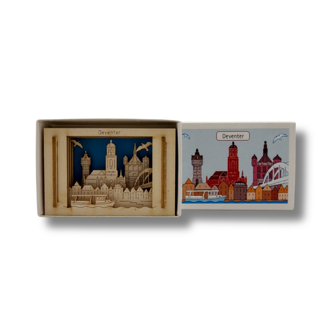 De mooie stad Deventer gevangen in een luciferdoosje. Klein van formaat, groots in karakter. Een verrassend en origineel item dat meteen een glimlach oproept.